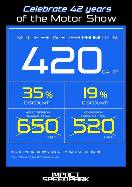 อิมแพ็ค สปีด พาร์ค เมืองทองธานี สนามโกคาร์ทมาตรฐานระดับโลก ภายใต้การบริหารของบริษัท อิมแพ็ค เอ็กซิบิชั่น แมเนจเม้นท์ จำกัด จัดเต็ม ฉลองครบรอบ 42 ปีของการจัดงาน “บางกอก อินเตอร์เนชั่นแนล มอเตอร์โชว์” ด้วยโปรโมชั่นสุดพิเศษ ลดราคารอบขับโกคาร์ทต่อรอบสูงสุด 35% โดยทั้งราคารอบขับสำหรับผู้ใหญ่และเด็กลดเหลือราคาเดียว เพียง 420 บาทเท่านั้น! (จากราคาปกติ 650 บาท/รอบสำหรับผู้ใหญ่ และ 520 บาท/รอบ สำหรับเด็ก) อย่าพลาด! โปรโมชั่นดีๆ ต้อนรับงาน บางกอก อินเตอร์เนชั่นแนล มอเตอร์โชว์ ครั้งที่ 42 ณ อิมแพ็ค ชาเลนเจอร์ 1-3 เท่านั้น โดยสามารถซื้อรอบขับโกคาร์ทได้ที่อิมแพ็ค สปีด พาร์ค บริเวณริมทะเลสาบ เมืองทองธานี ตั้งแต่วันที่ 22 มีนาคม – 4 เมษายน ศกนี้ สอบถามรายละเอียดเพิ่มเติมได้ที่ โทรศัพท์ 02-055-8900 หรือ www.facebook.com/impactspeedpark