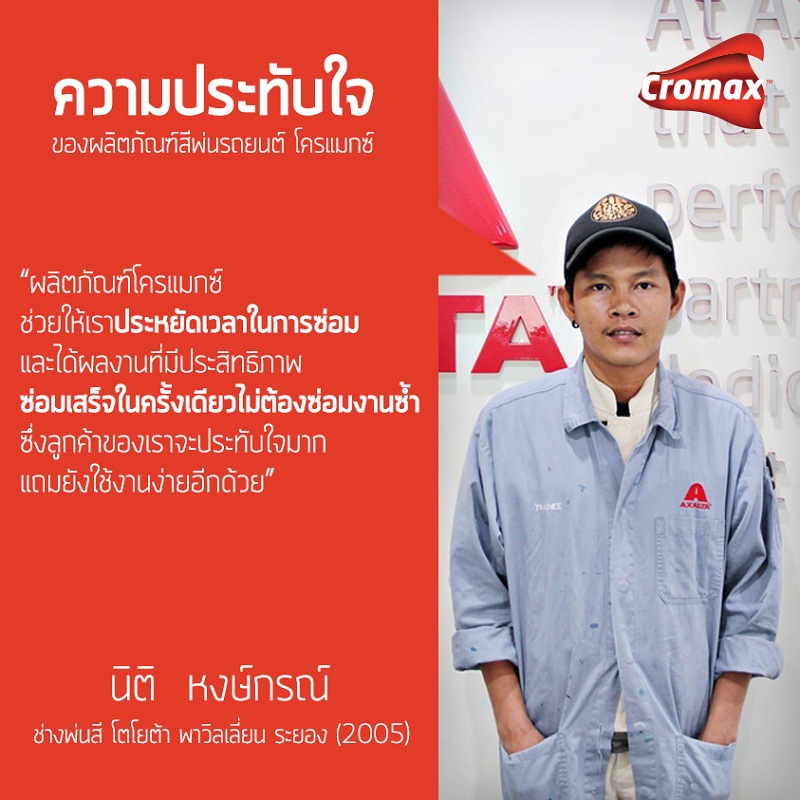 นิติ หงษ์กรณ์ ช่างพ่นสี โตโยต้า พาวิลเลี่ยน ระยอง (2005) ให้ความเห็นว่า “ผลิตภัณฑ์โครแมกซ์ ช่วยให้เราประหยัดเวลาในการซ่อม และได้ผลงานที่มีประสิทธิภาพ ซ่อมเสร็จในครั้งเดียวไม่ต้องซ่อมงานซ้ำ ซึ่งลูกค้าของเราจะประทับใจมาก แถมยังใช้งานง่ายอีกด้วย”